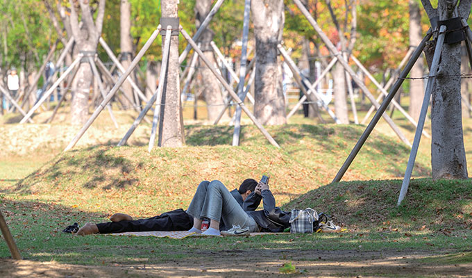 햇살 좋은 오후, 공원을 찾은 이들의 얼굴에는 여유와 행복이 가득하다. 한 손에는 돗자리, 다른 손에는 먹거리를 야무지게 챙긴 이들이 느긋한 발걸음을 옮기는 곳은 바로 공원 중앙에 위치한 드넓은 잔디광장이다. 선선한 바람이 불어오며 피크닉을 즐기러 온 사람들로 북적이는 공원에서도 가장 많은 사랑을 받는 장소 중 하나이다. 고사리 같은 아이의 손을 잡고 유모차를 끄는 부부, 돗자리에 누워 소소한 행복을 즐기는 커플, 간식으로 가득 채운 가방을 메고 소풍 나온 아이들까지, 다양한 모습들이 어우러져 있지만 이들의 목적만큼은 동일해 보인다. 바쁜 일상에서 잠시나마 쉼을 가지는 것.