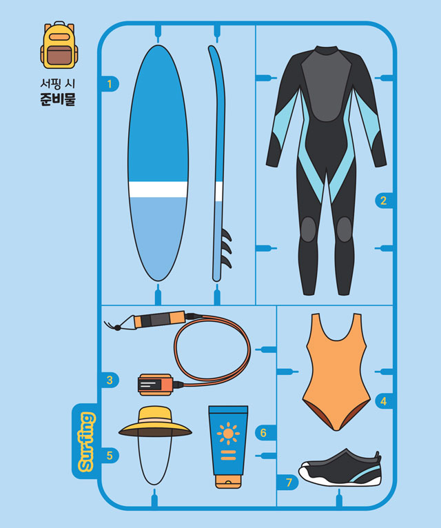 서프보드, 웻수트, 리쉬코드(발목줄) 등 장비에 이상이 없는지 반드시 확인