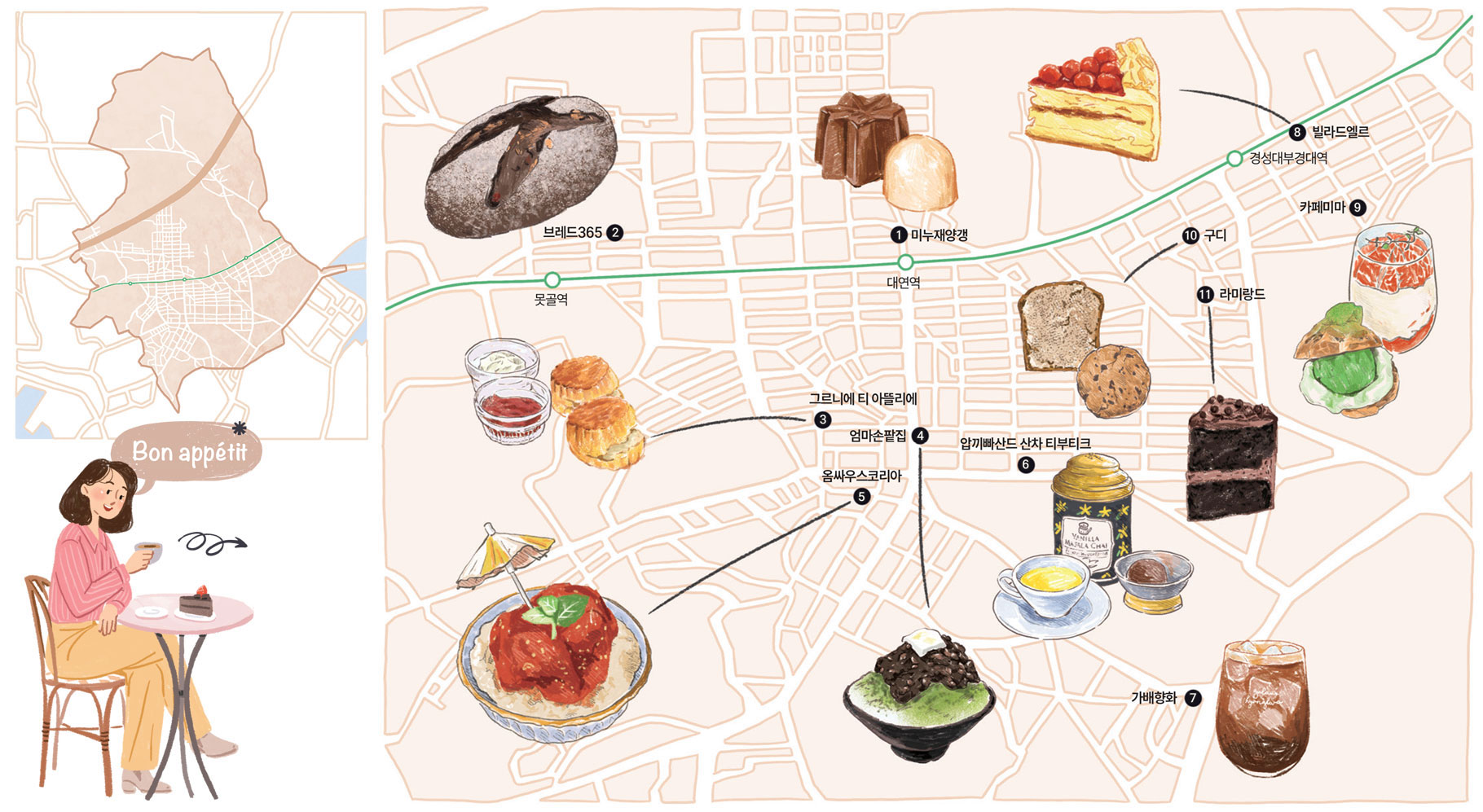 인근 대학가 학생들에게 사랑받는 케이크 전문 카페. 진득한 초콜릿 맛의 마틸다 케이크가 대표 메뉴이며 이 외에도 상큼한 맛이 인상적인 레몬커드&피스타치오 케이크, 프랑스산 마롱크림과 보늬밤이 들어간 몽블랑 케이크 등 다양한 맛의 케이크를 선보이고 있기에 하나만 고르기가 쉽지 않다. 향긋한 홍차까지 곁들이면 달콤한 오후가 완성된다.